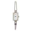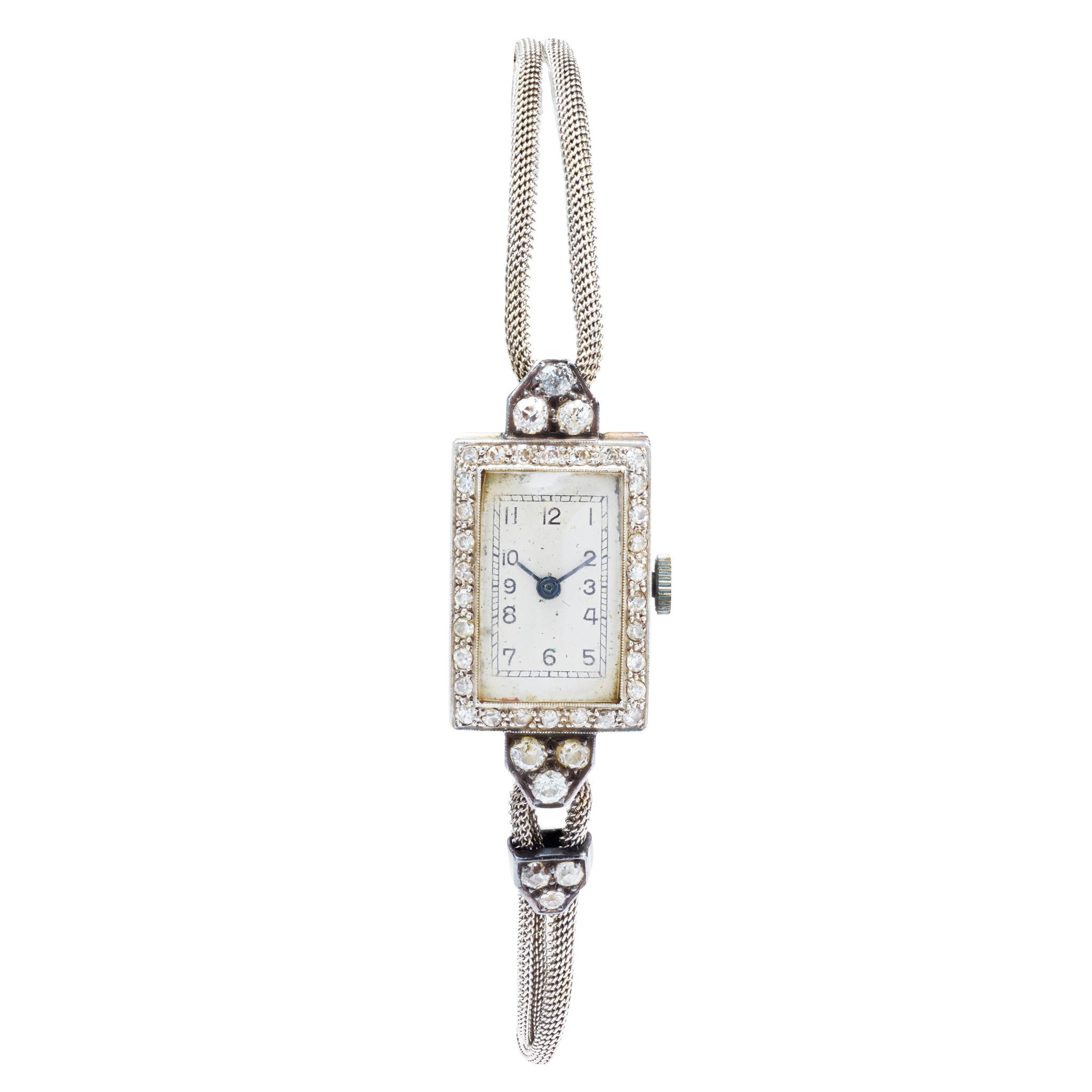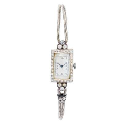 The rectangular dial with Arabic numerals and outer railroad seconds track, the bezel and shoulders set with small old round-cut diamonds, to a woven-link bracelet and fold-over clasp, inner case stamped ALL PLATINUM