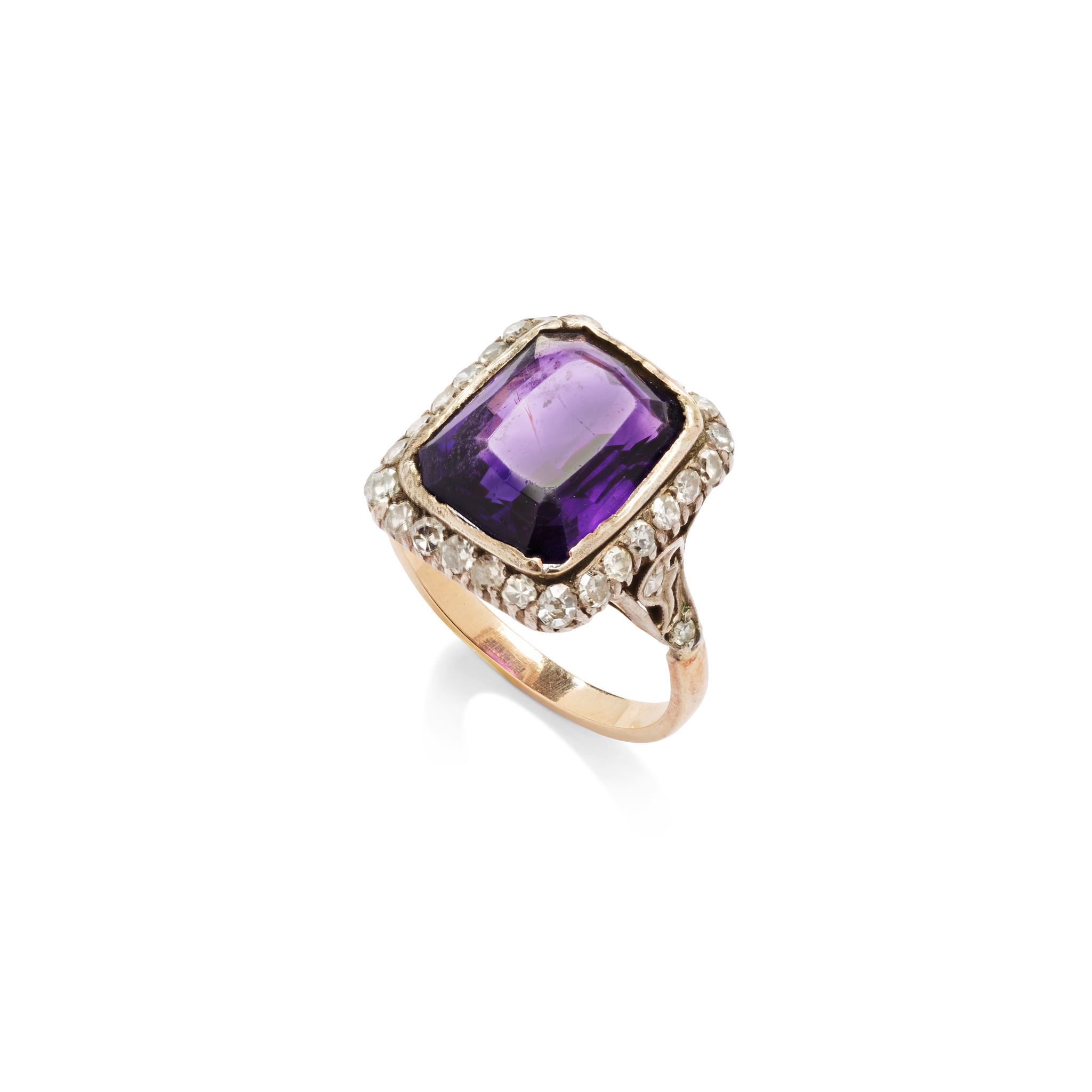 Collet-set with a rectangular cut-corner step-cut amethyst, in border of single-cut diamonds, foliate-style diamond-set shoulders (one diamond deficient), plain band, unmarked