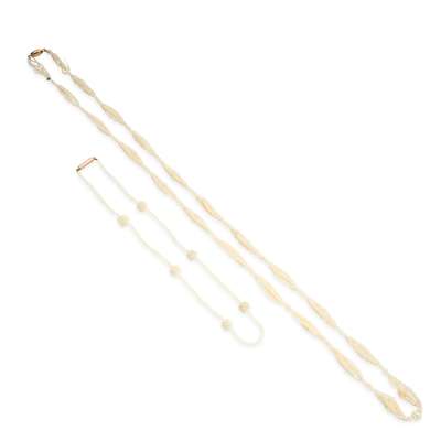 The first composed of five strands of seed pearls, set at intervals with three graduated pearl spacers, to a lozenge shaped clasp, unmarked; the second composed of a single strand of seed pearls, set at intervals with a seed pearl ball clusters, lozenge shaped clasp, stamped 9ct (pearls are untested) (2)