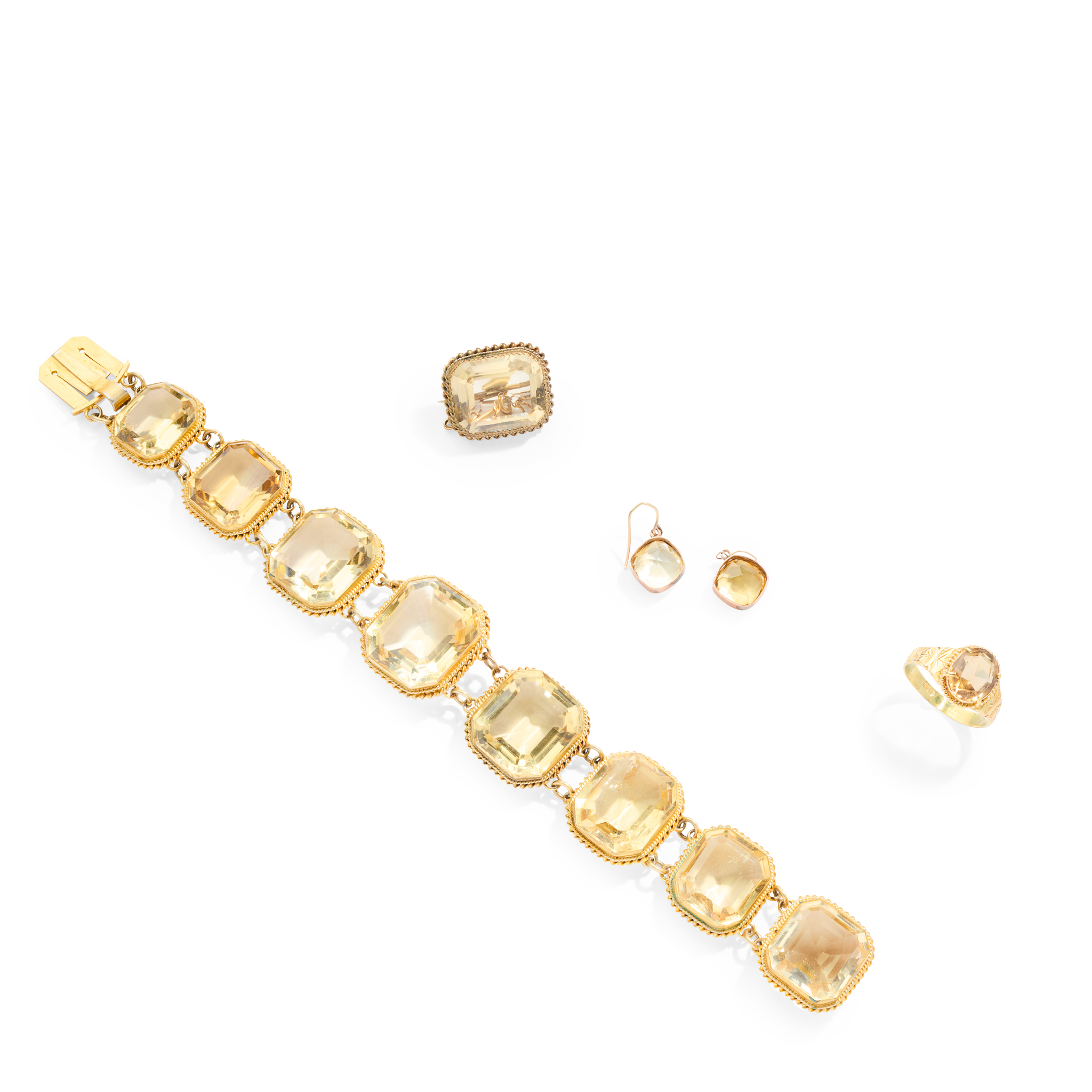 Comprising a bracelet, brooch, pair of earrings, and ring, each composed of collet-set graduated rectangular step-cut citrines, in a rope-twist border, indistinct marks (4)
