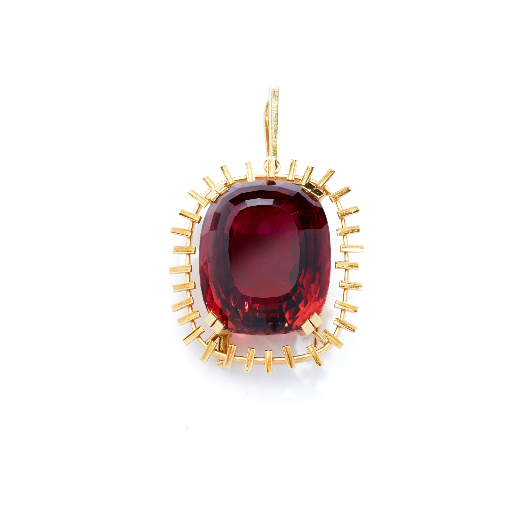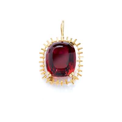 Claw-set with a mixed cut brownish-purple tourmaline, radiating panel surround, detachable bale, unmarked
