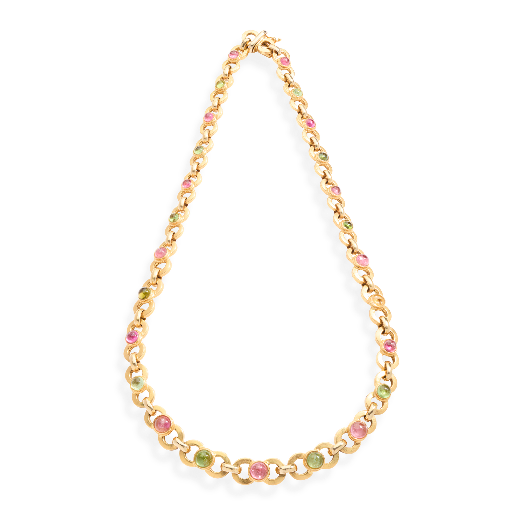 Composed of graduated circular links, collet-set at intervals with cabochon pink and green tourmalines (one deficient), UK hallmark