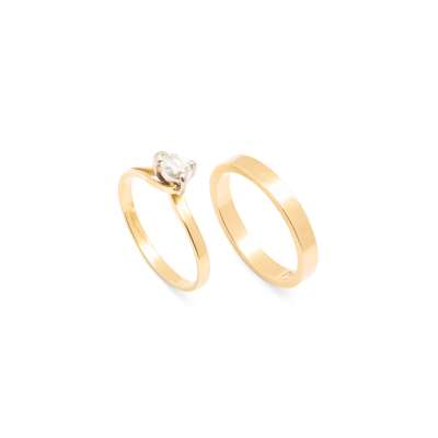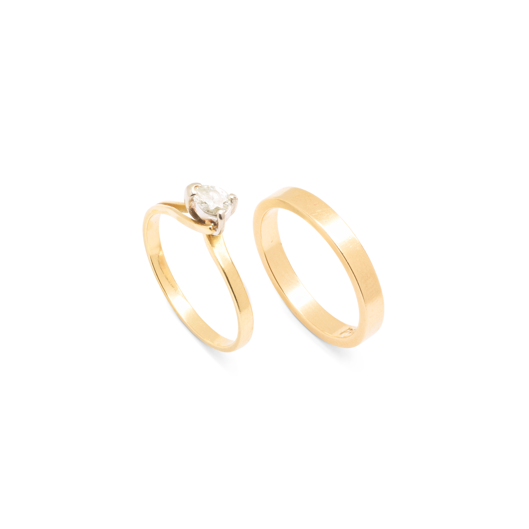 The single-stone ring, claw-set with a pear-cut diamond, plain band, stamped 750; together with a plain band, stamped 750 (2)