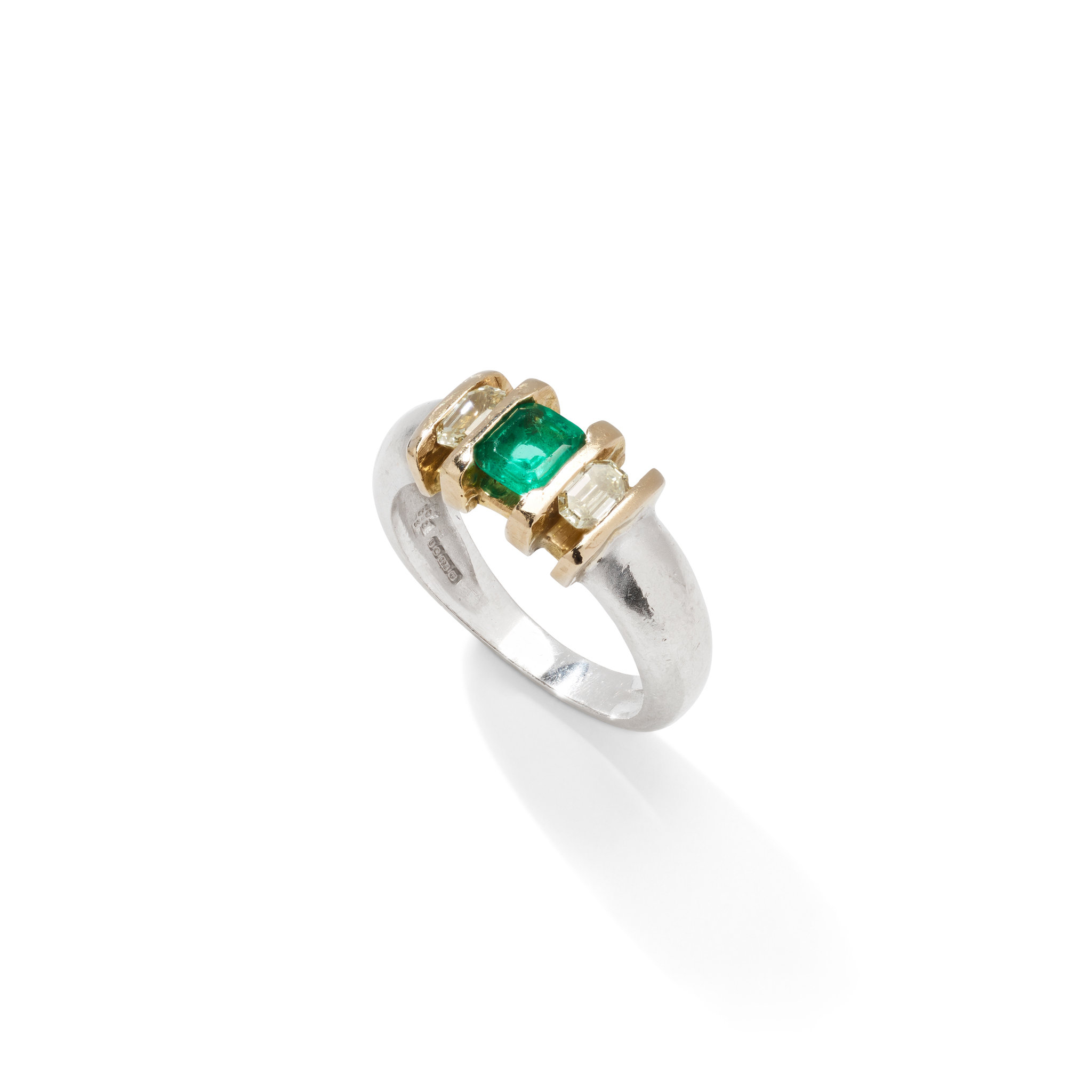 Bar-set with a square step-cut emerald and two rectangular step-cut diamonds, plain band, UK hallmark