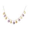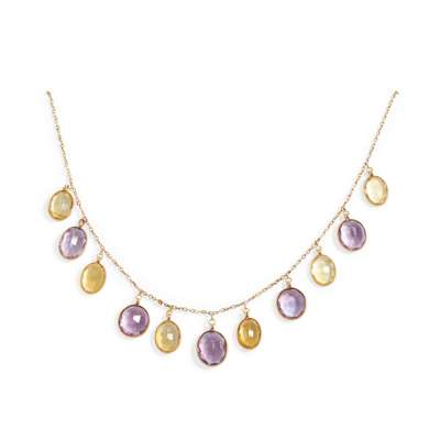 The trace-link chain suspending alternating collet-set oval and cushion-cut amethyst and citrines, hook clasp, unmarked