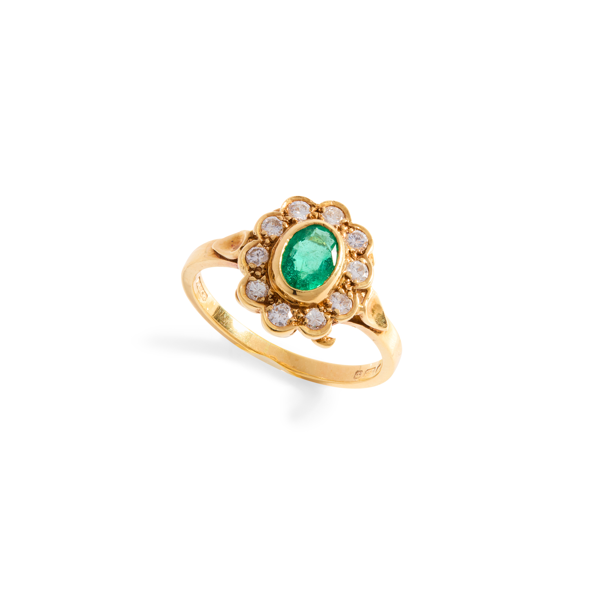 Collet-set with an oval-cut emerald, in a border of round brilliant-cut diamonds, plain band, UK hallmark
