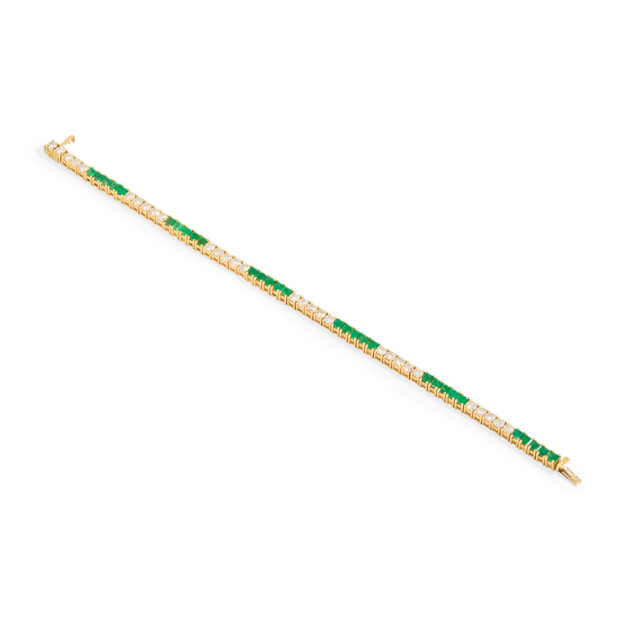 Claw-set with alternating sections of round brilliant-cut diamonds and square step-cut emeralds, concealed clasp, UK hallmark