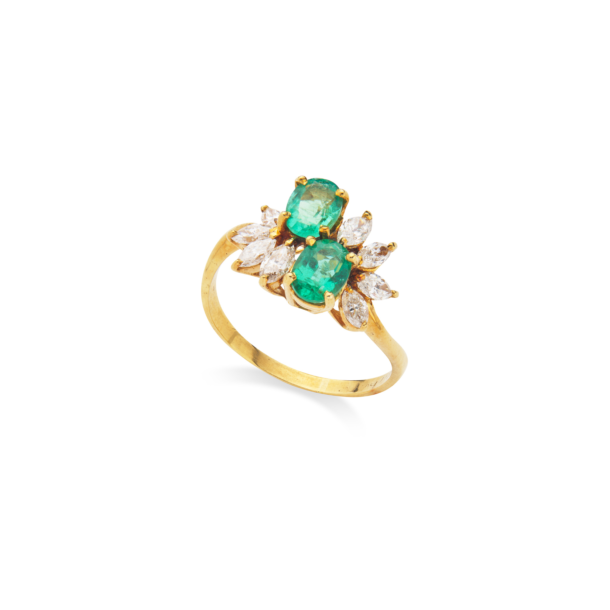 Claw-set with two oval-cut emeralds, and eight marquise-cut diamonds, plain band, UK hallmark