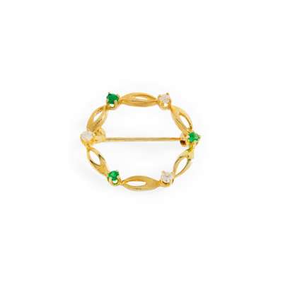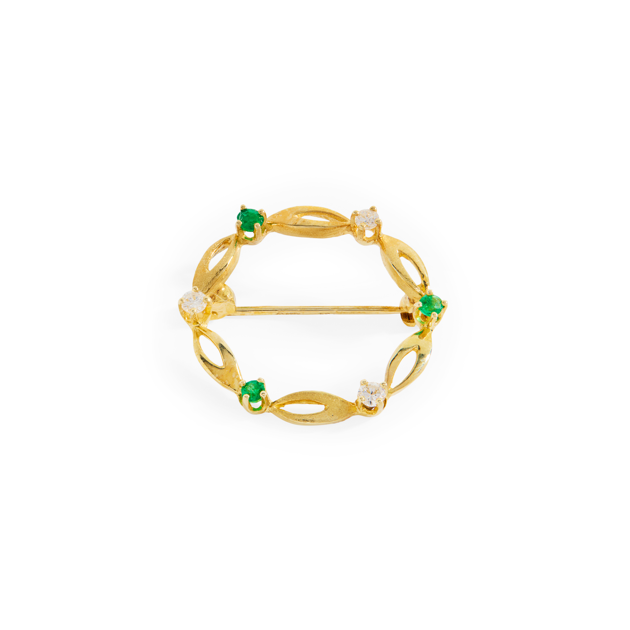 Of circular outline, set with round-cut emeralds and diamonds, UK hallmark