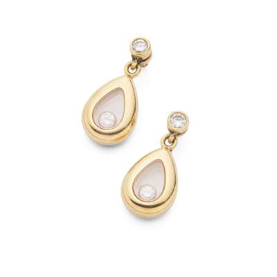 Each collet-set with a round brilliant-cut diamond, suspending a pear-shaped glazed panel with one ‘floating’ diamond, signed, post and butterfly fittings, numbered 83/1155 9614225