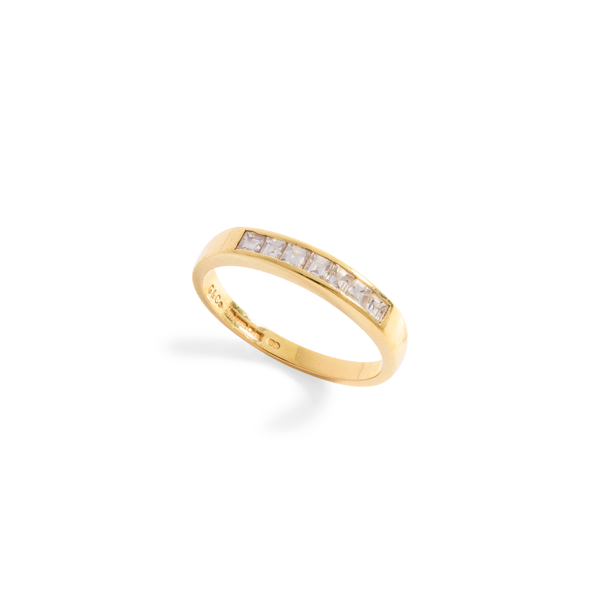 Channel-set with a row of square step-cut diamonds, plain band, signed, UK hallmark