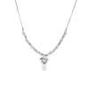 Composed of stylised scrolling links, suspending a cultured pearl drop set with two small round-cut diamonds, to a trace-link chain, unmarked