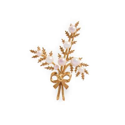 Modelled as a ribbon-tied spray of ferns, set with eight Scottish freshwater pearls, unmarked