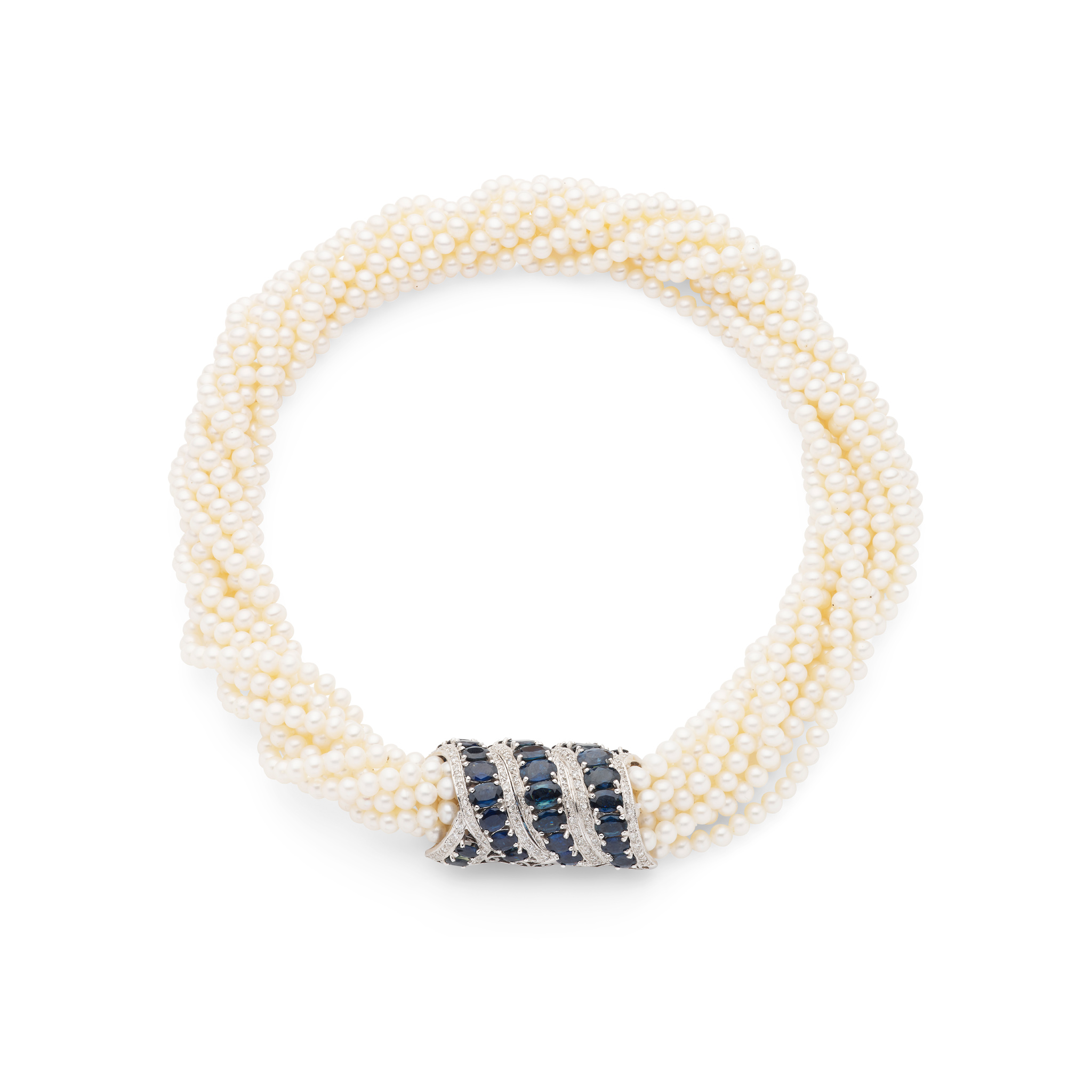 Composed of ten strands of cultured freshwater pearls, the feature clasp of scrolling design, set with three rows of graduated oval-cut sapphires, each row in a border of small round brilliant-cut diamonds, UK hallmark