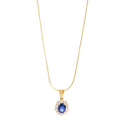 Claw-set with an oval-cut sapphire, in a border of ten round brilliant-cut diamonds, indistinctly marked; snake-link chain, stamped 750