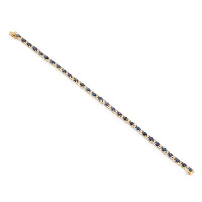 Claw-set with alternating oval-cut sapphires and pairs of small round brilliant-cut diamonds, concealed clasp, stamped K18 750