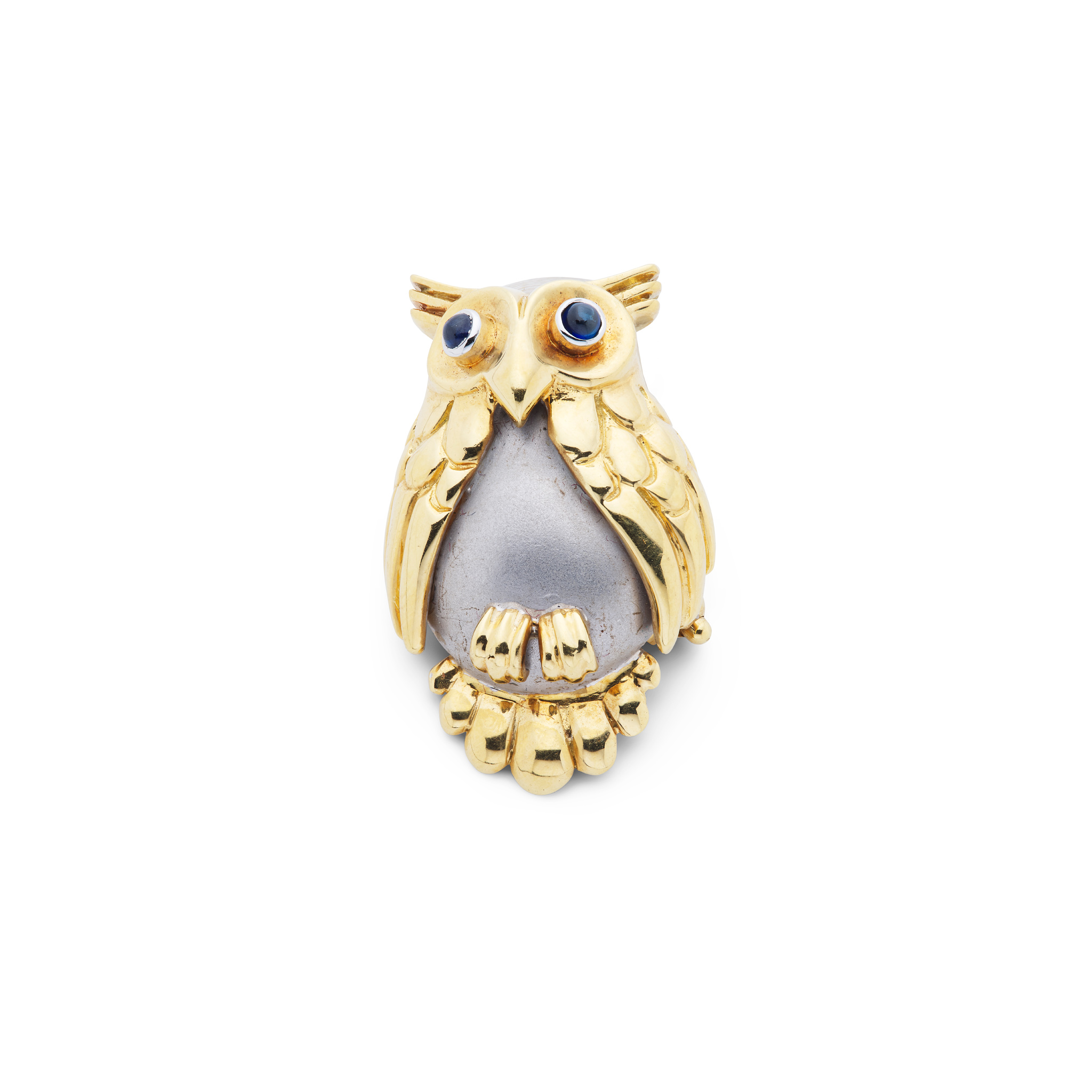 Modelled as an owl with a silvered enamel body and cabochon sapphire eyes, unmarked