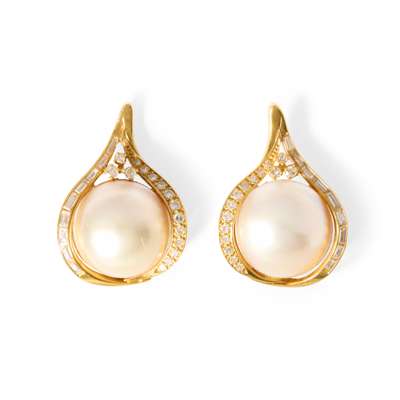 Each set with a mabé-pearl, in a scrolling border of graduated eight-cut and baguette-cut diamonds, clip fittings, signed CHAUMET LONDON