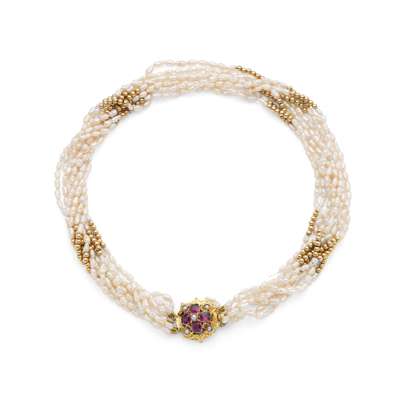 Composed of eight strands of cultured freshwater pearls with bead spacer detail (one strand broken), to an antique clasp, set with four cushion-cut garnets and seed pearl detail, unmarked