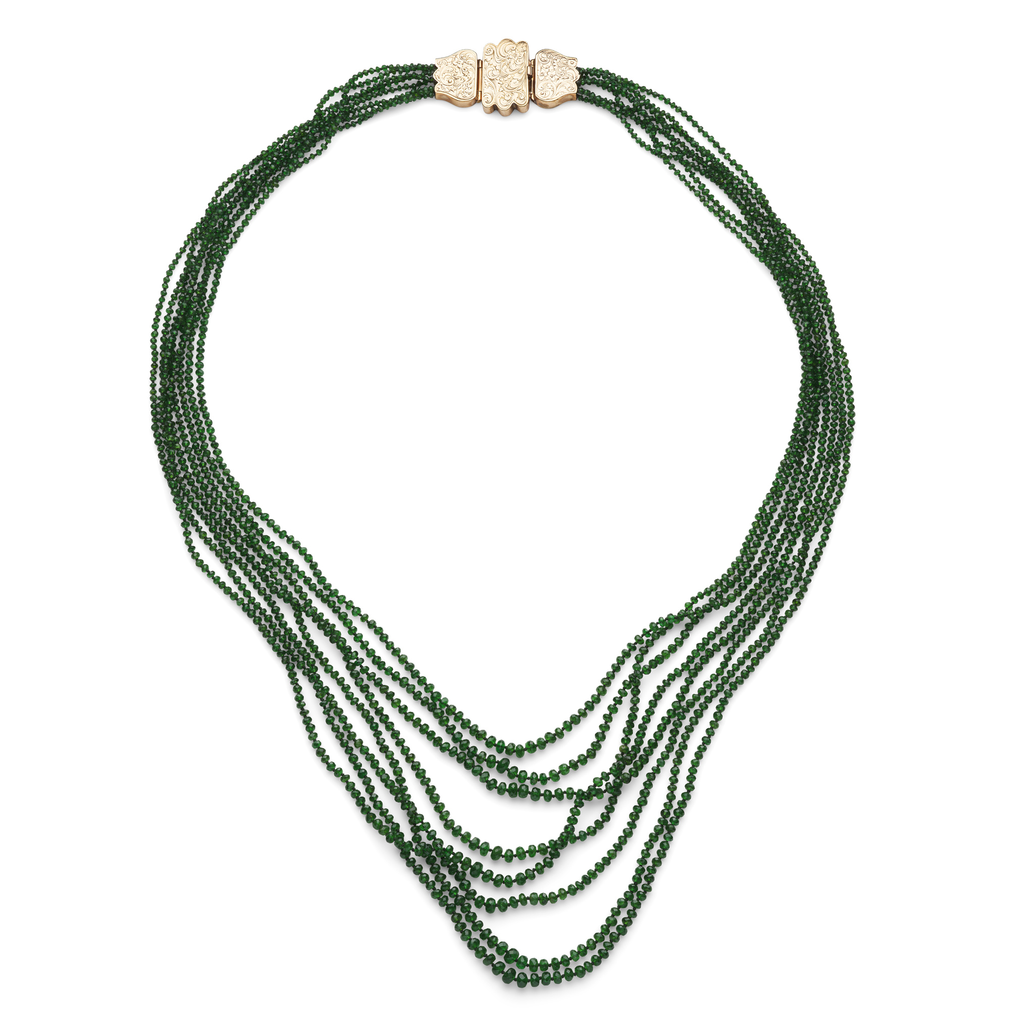 Composed of eight strands of graduated faceted tsavorite garnet beads, engraved decorative clasp, unmarked