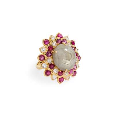 Claw-set with a circular cabochon star-sapphire, in a radiating border of round-cut rubies and white sapphires, plain band, stamped Au750