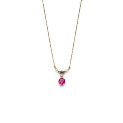 Collet-set with a round-cut ruby, with seed pearl and small round-cut diamond detail, trace-link chain, unmarked