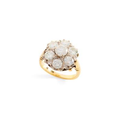 Claw-set with seven round brilliant-cut diamonds, plain band, unmarked