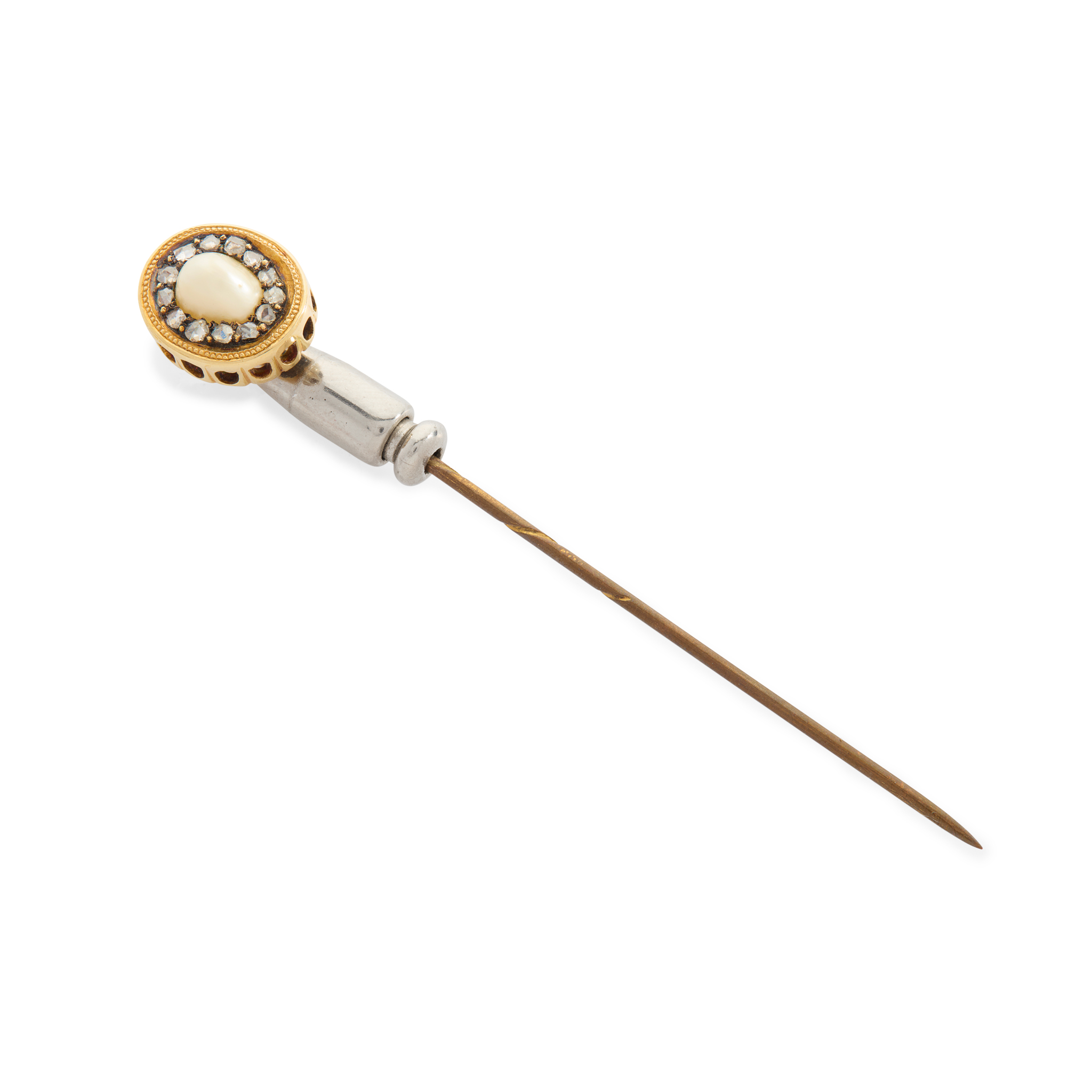 Set with a single ovoid pearl (untested), in a border of rose-cut diamonds, unmarked