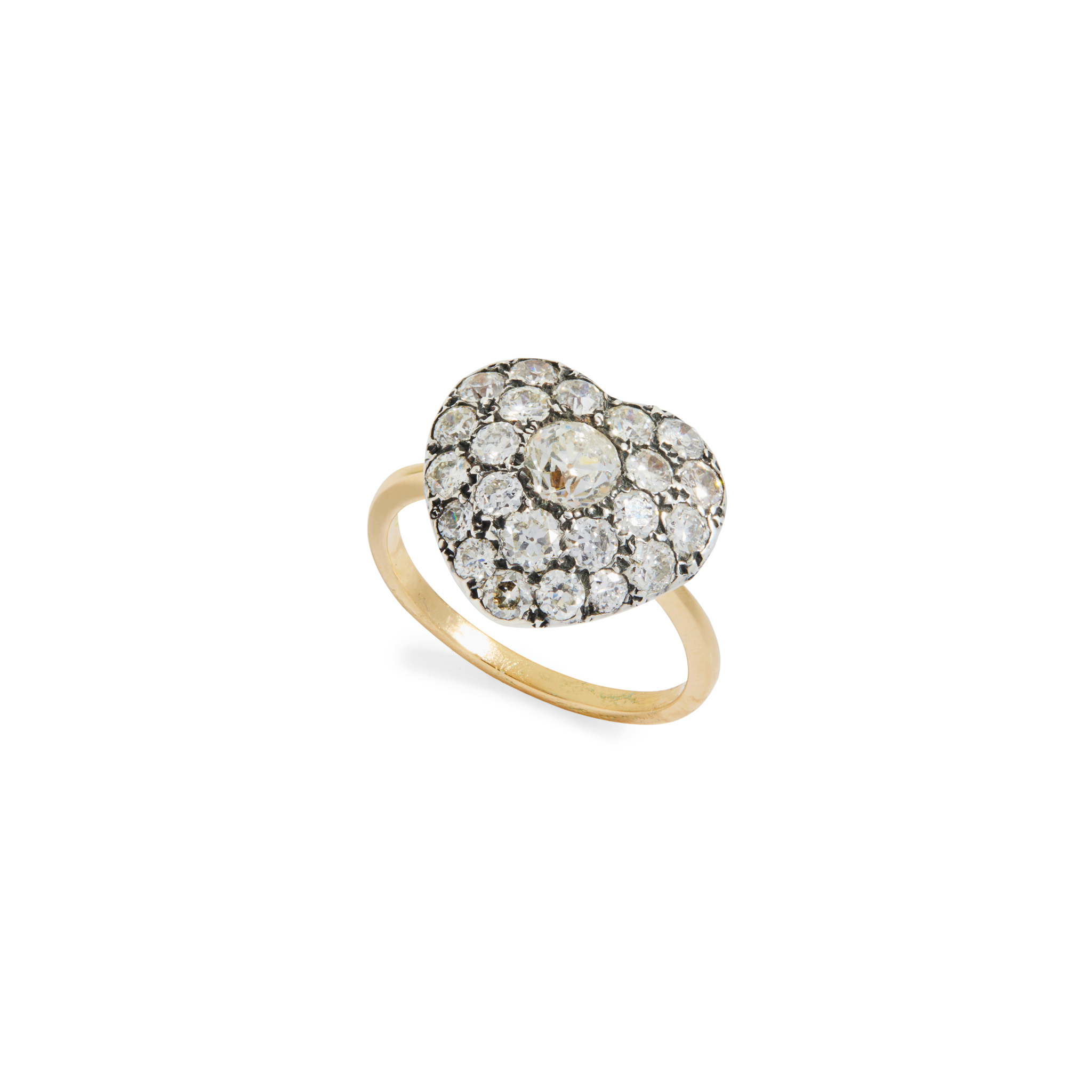 The heart-shaped cluster pavé-set with graduated old round-cut diamonds, plain band, unmarked