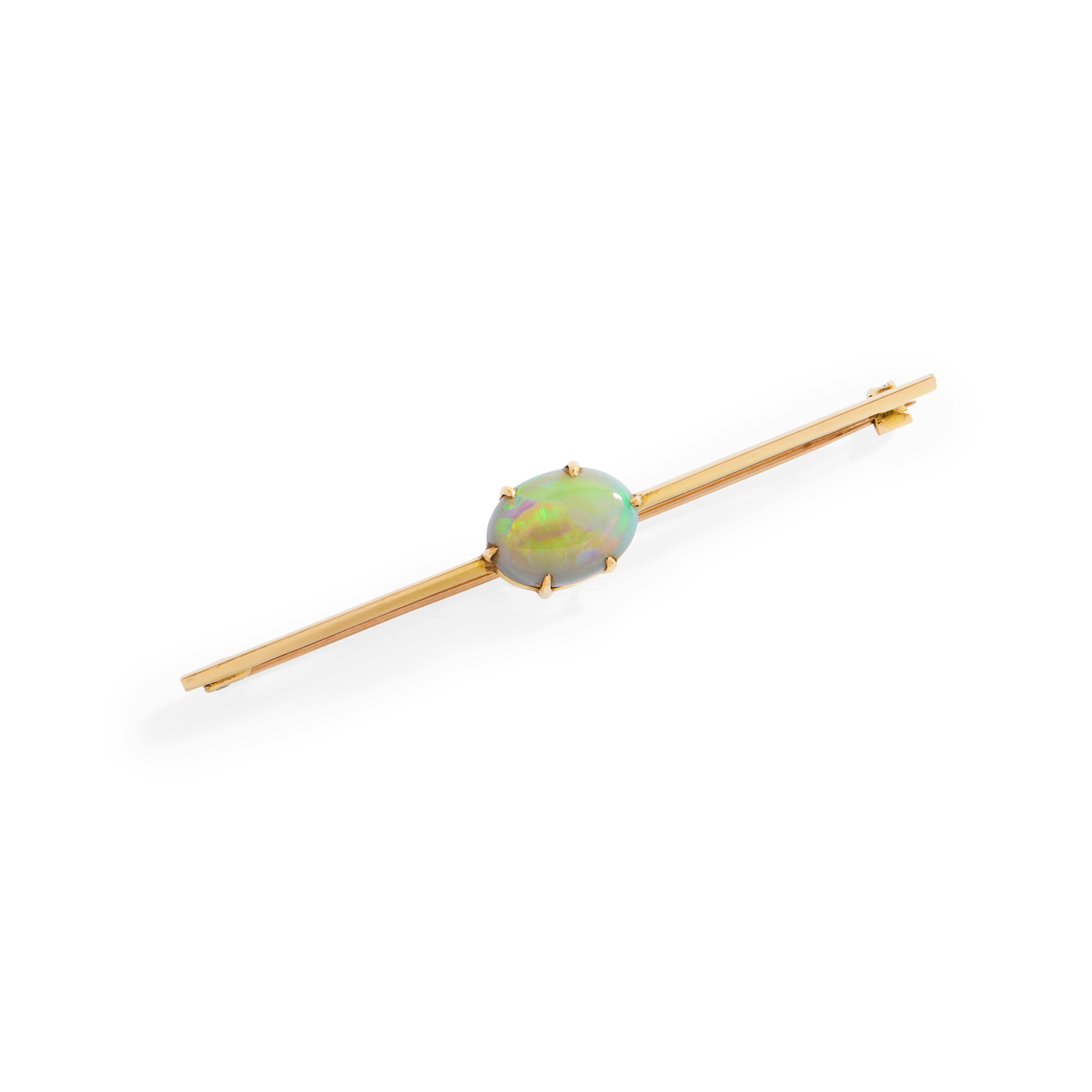 Claw-set with an oval cabochon black opal, plain bar brooch, stamped 15ct