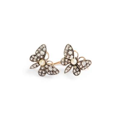 Modelled as two butterflies, each pavé-set with graduated old round-cut diamonds and a central seed pearl, unmarked