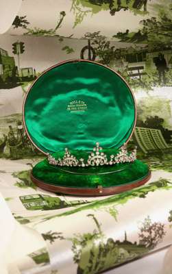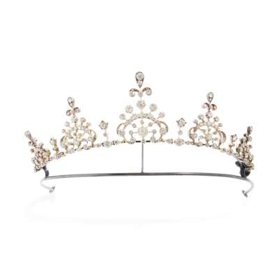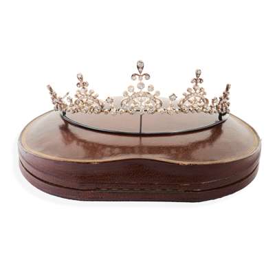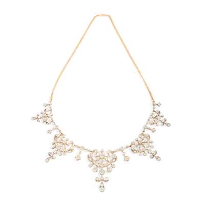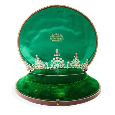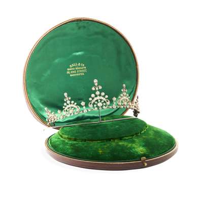 Composed of five graduated tapering clusters of pierced scrolling detail, set throughout with graduated old round-cut diamonds, unmarked, suspended from a detachable curb-link chain, with optional tiara frame; in a fitted box for Hall & Co … Manchester