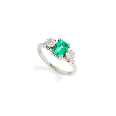 Claw-set with a rectangular step-cut emerald, and two round brilliant-cut diamonds, plain band, indistinct marks