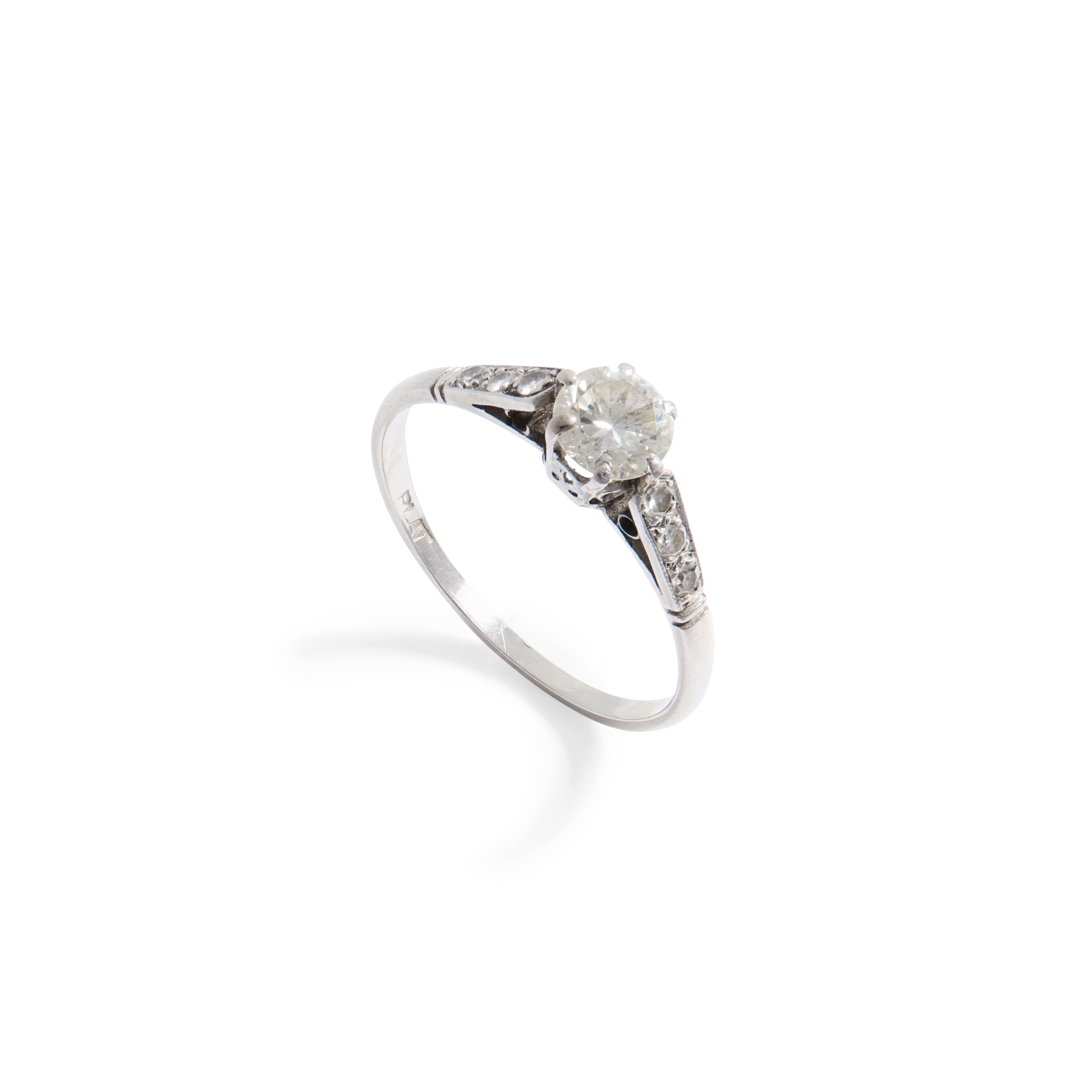 Claw-set with an old round-cut diamond, weighing approximately 0.60cts, each shoulder set with three eight-cut diamonds, plain band, stamped PLAT