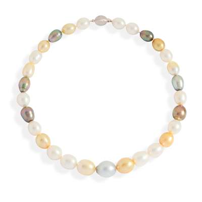 Composed of a single row of slightly graduated ovoid white and golden South Sea pearls and Tahitian pearls, the ovoid clasp gypsy-set with round brilliant-cut diamonds, stamped 750