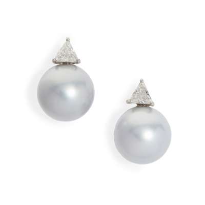 Each claw-set with a trilliant-cut diamond, above a light grey Tahitian pearl, post and butterfly fittings, UK hallmark