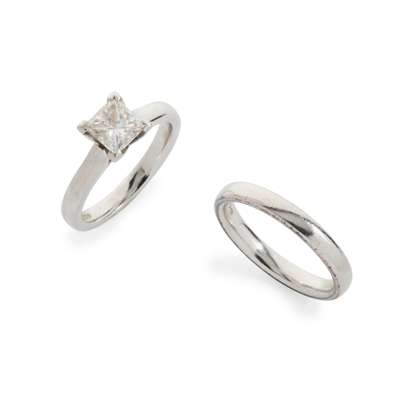 Claw-set with a princess-cut diamond, plain band; together with a matching platinum band, both with UK hallmarks (2)