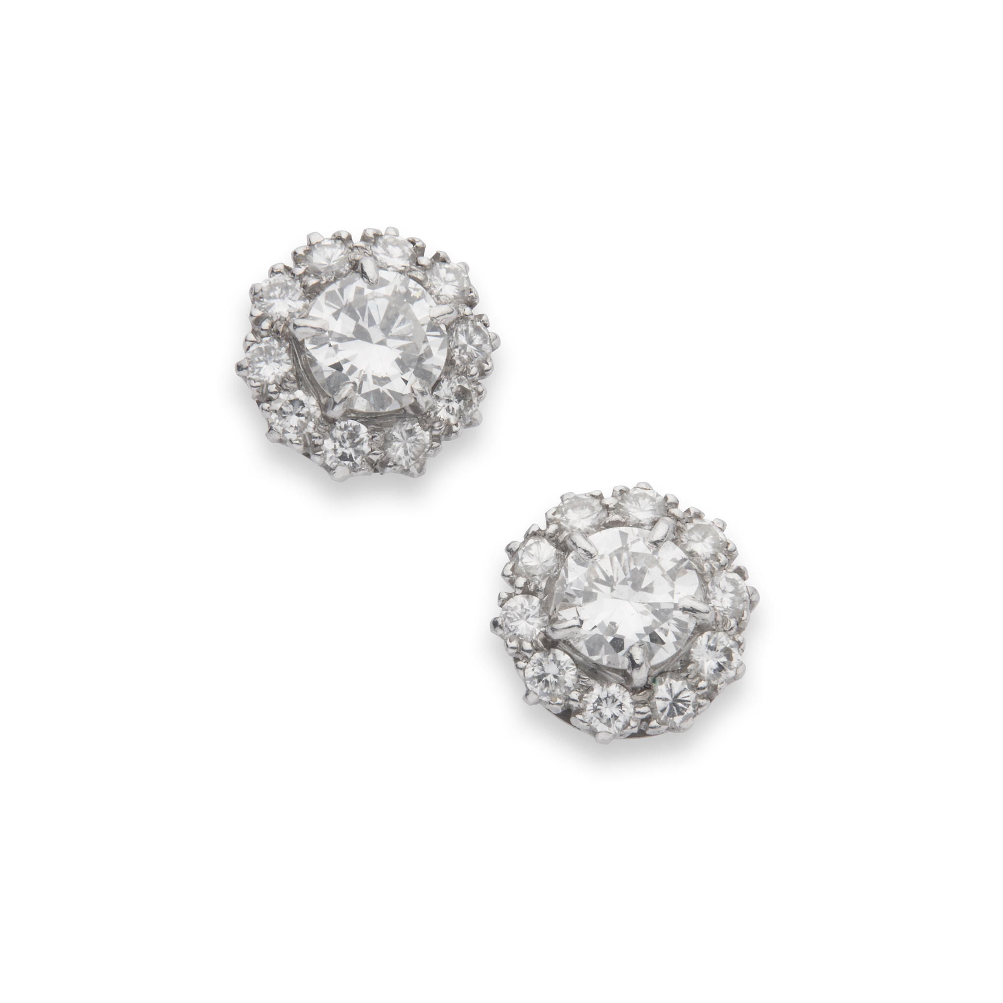 Each claw-set with a round brilliant-cut diamond, in a border of ten smaller round brilliant-cut diamonds, post and butterfly fitting, unmarked