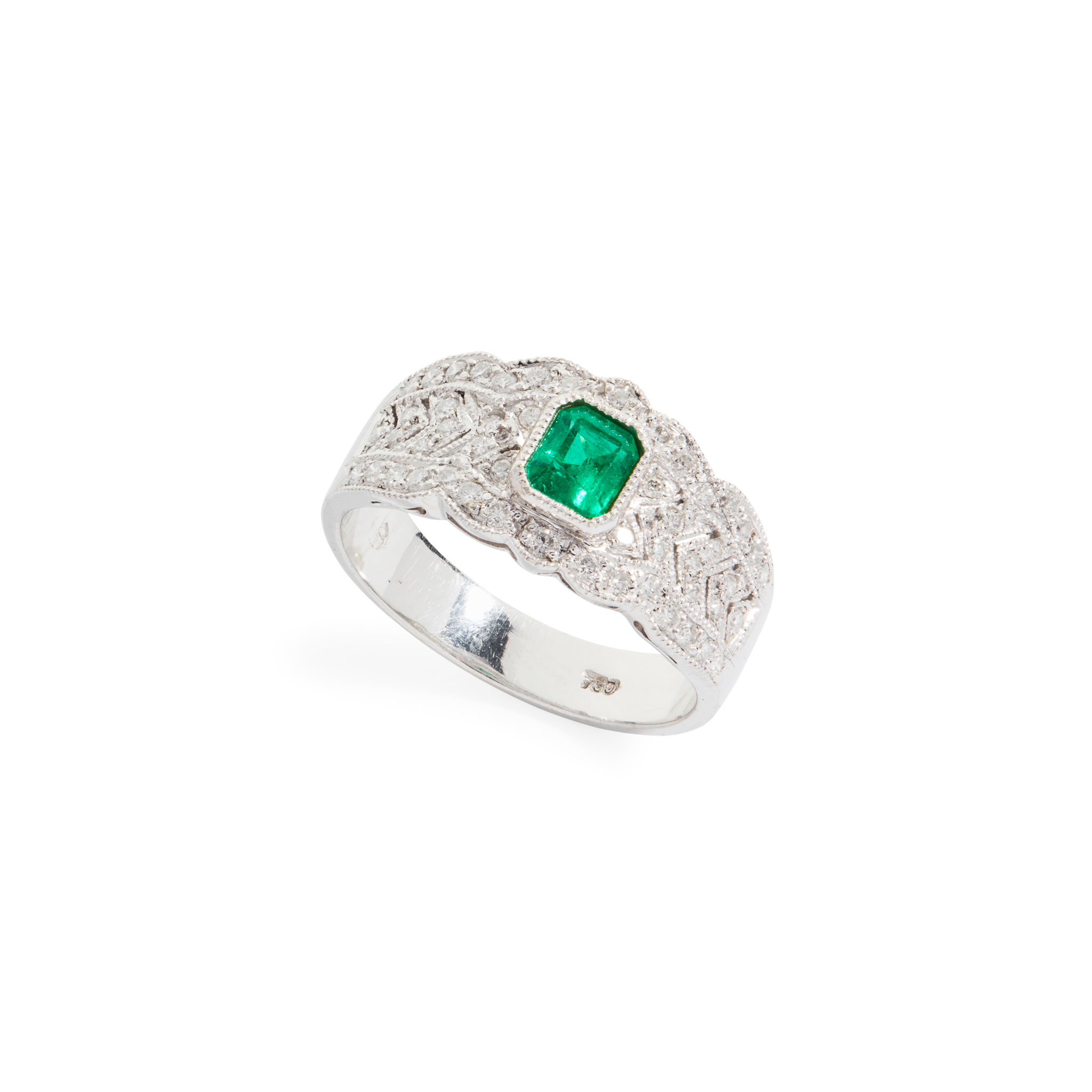 Millegrain-set with a cut-cornered rectangular-cut emerald, the surround with pierced detail set with round brilliant-cut diamond detail, stamped 750
