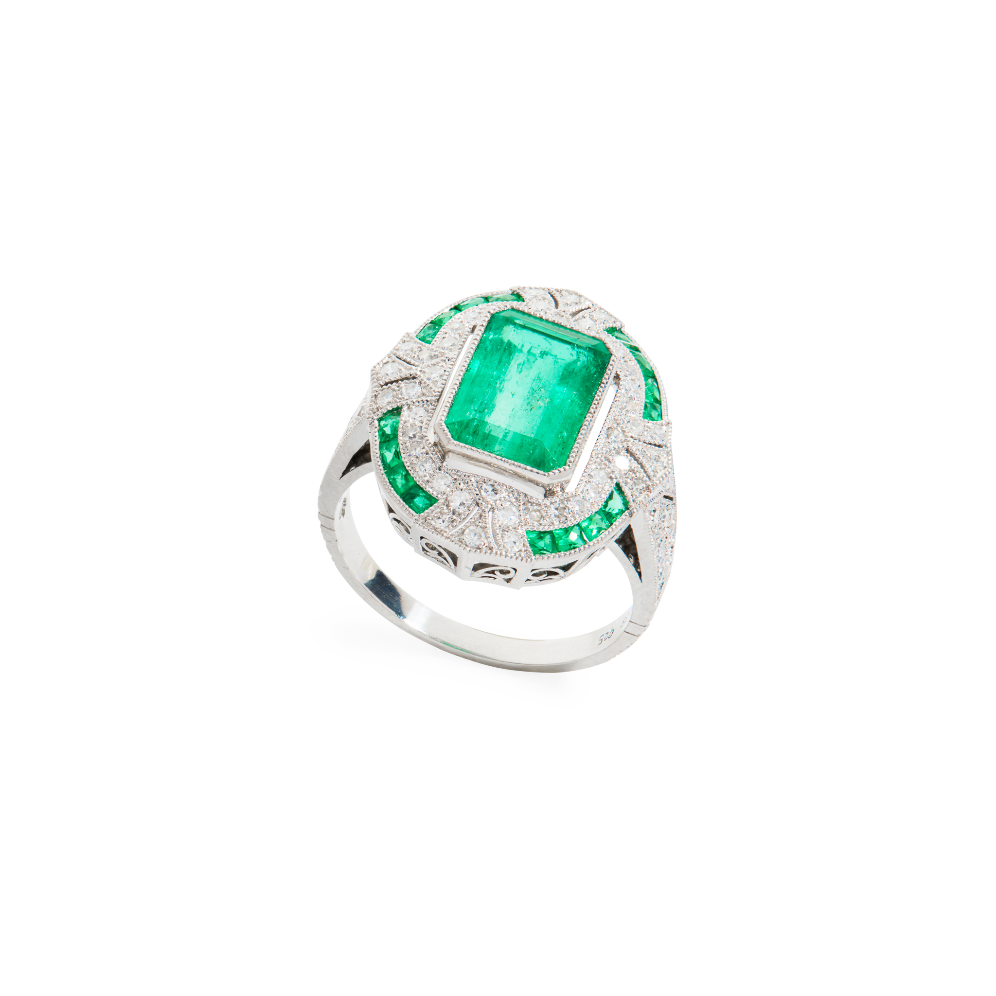 Millegrain-set with a cut-cornered rectangular-cut emerald, the stylised border and shoulders set with graduated eight-cut diamonds and calibré-cut emeralds, stamped 850 PLAT