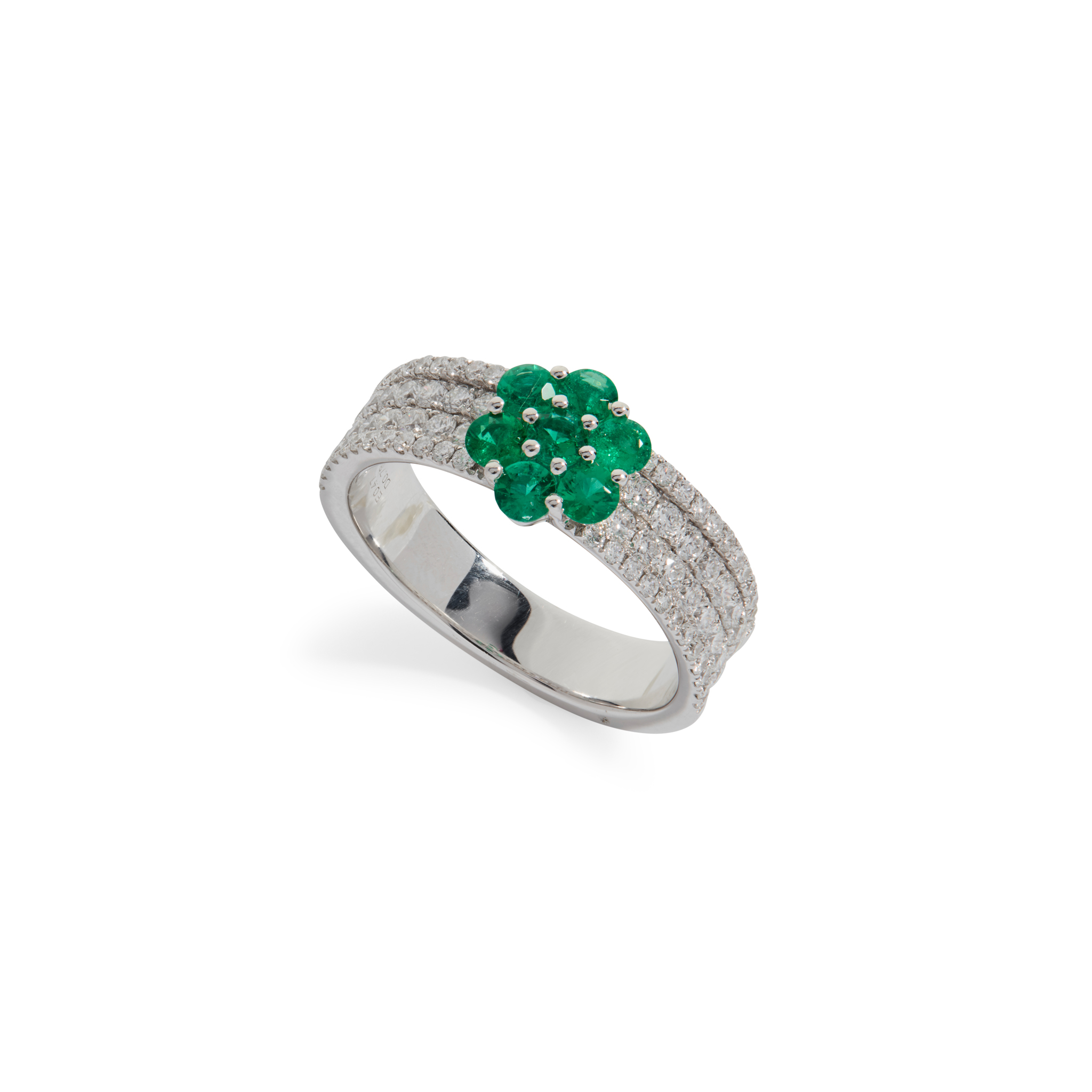 Claw-set with seven round-cut emeralds, the broad shoulders pavé-set with round brilliant-cut diamonds, stamped K18