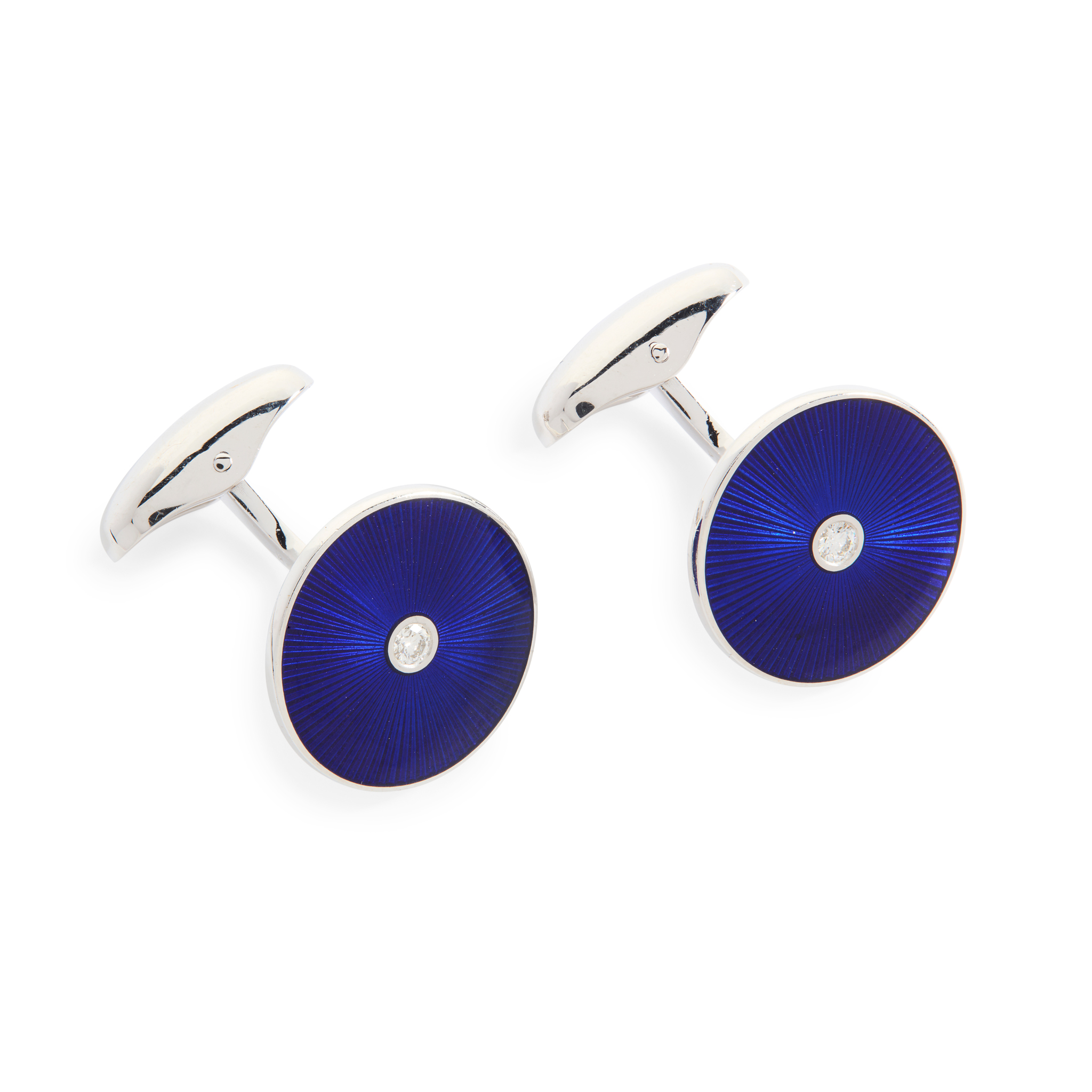 Each principal terminal with blue guilloché enamel ground, collet-set with a single round brilliant-cut diamond, secondary torpedo terminals, stamped FABERGE 54 750; in original box
