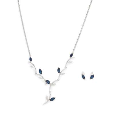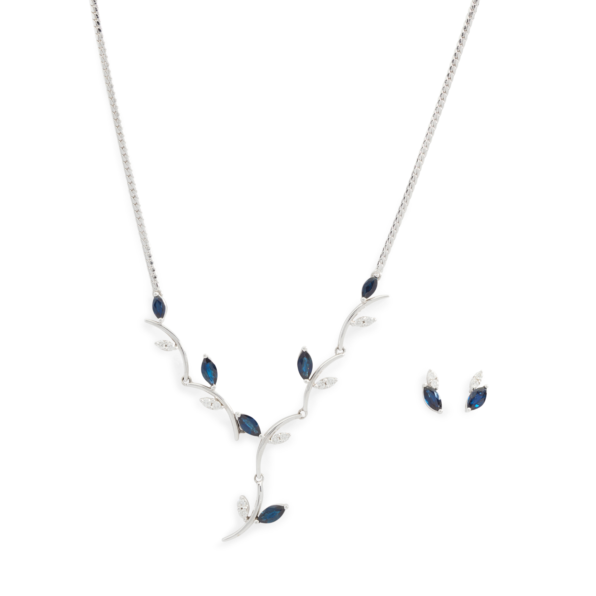 Including earrings and necklace, the necklace of stylised foliate design, set at intervals with six marquise-cut sapphires and small round brilliant-cut diamonds, to a flattened link chain; the earrings of matching design, post and butterfly fittings, both stamped 18k (2)