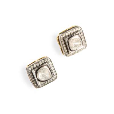 Each of square outline set with a central Polki diamond in a border of eight-cut diamonds, post and butterfly fittings, stamped 18k; with original box and outer pochette