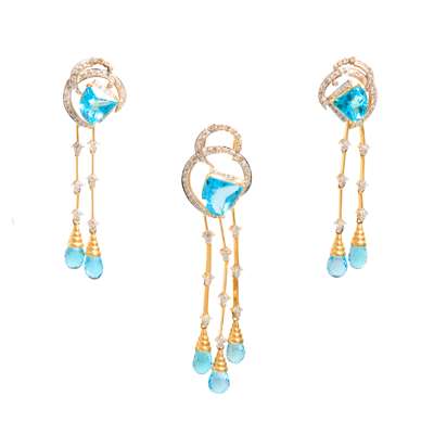 The pendant composed of a principal claw-set modified pear-cut blue topaz, in a round brilliant-cut diamond surround, suspending three graduated drops with round-cut diamond detail and briolette-cut blue topaz terminals, the earrings of matching design, post and butterfly fittings, unmarked (2)