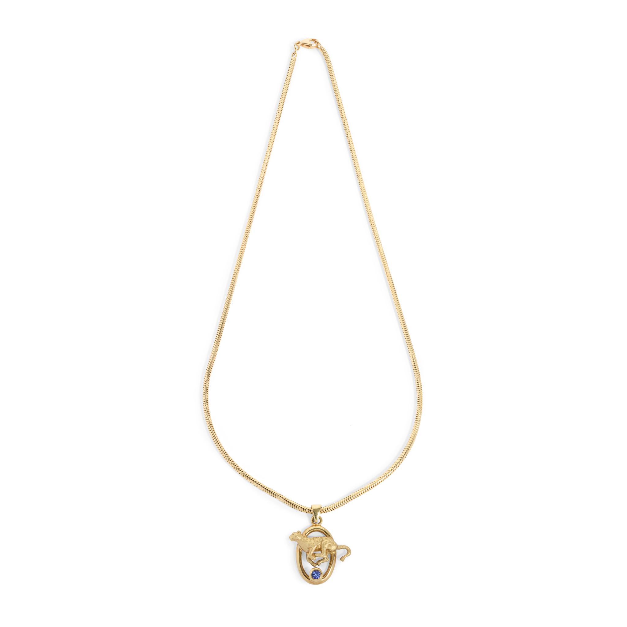 The oval pendant with applied leopard motif, collet-set with a round-cut Tanzanite, snake-link chain, UK hallmark