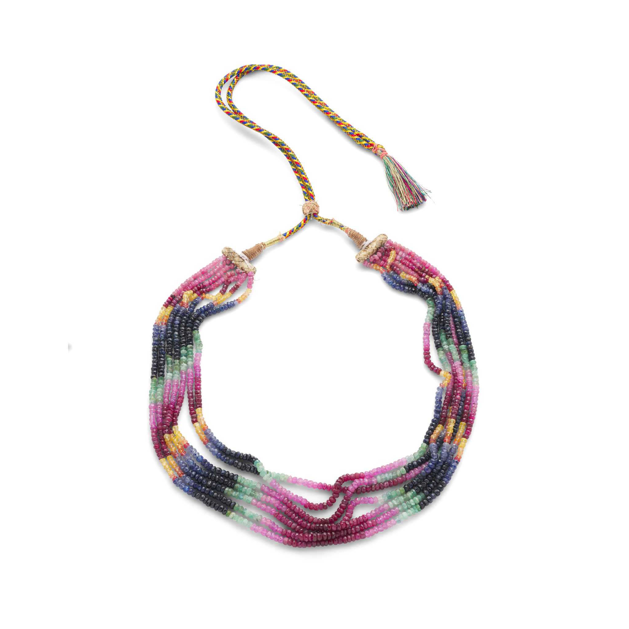 Composed of seven rows of facetted sapphire, ruby and emerald beads, to an adjustable cord necklace