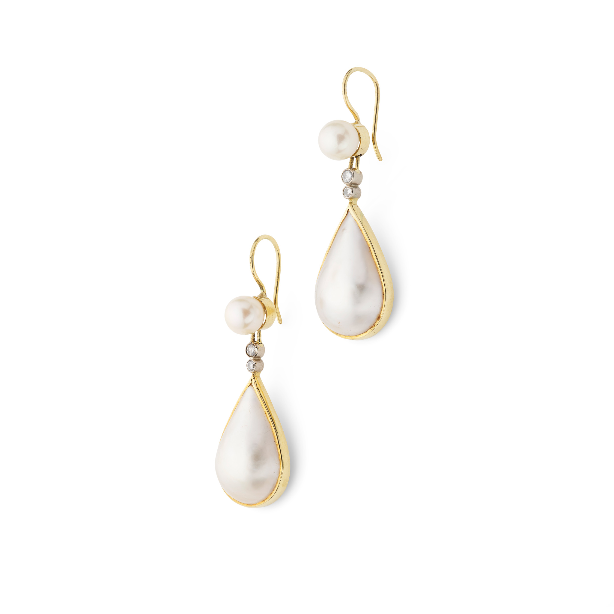 Each set with a single cultured pearl, suspending two collet-set round brilliant-cut diamonds and a mabé-pearl drop, hook fittings, stamped 18ct