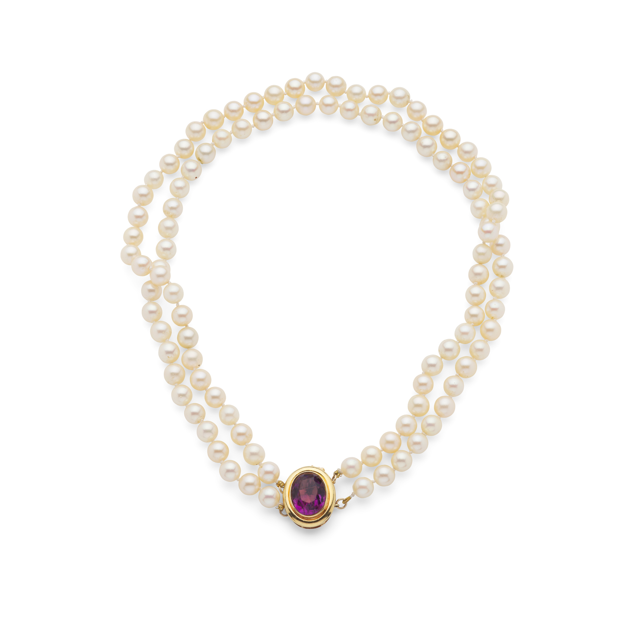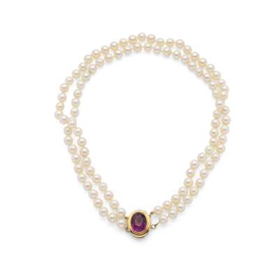 Composed of two rows of cultured pearls, the clasp collet-set with an oval-cut amethyst, stamped 14k 585