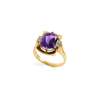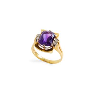 Claw-set with a cushion-cut amethyst in a scalloped border, the shoulders set with two round brilliant-cut diamonds, plain band, stamped 750 18k